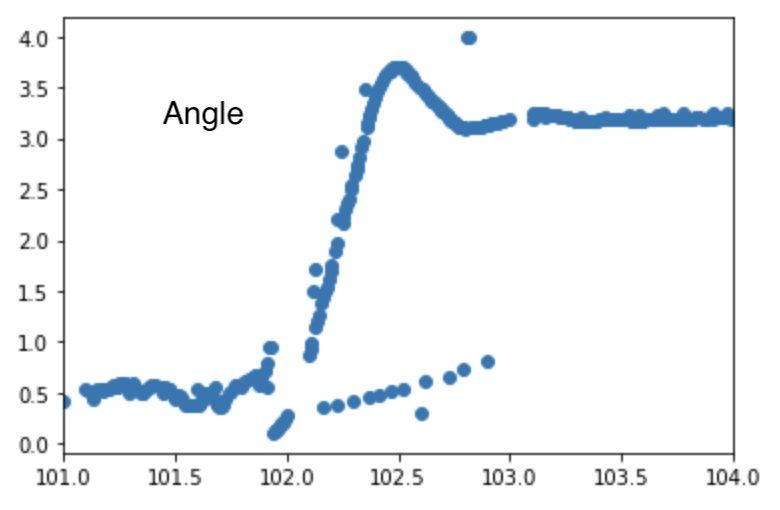 Include graphs of all appropriate measurements needed to debug your PID controller. Below is an example the set point, angle and motor offset plotted as a function of time. Observe the overshoot and settling time of the angle and the response of the motor values.